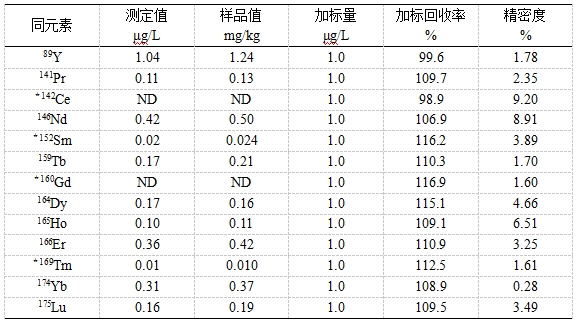 参考《GB/T 40798 离子型稀土原矿化学阐发体例 稀土总量的测定 电感耦合等离子体质谱法》,接纳氢氟酸、硝酸、高氯酸停止湿法消解。操纵碰撞反映情势节制氧化物产率,下降轻稀土氧化物/氢氧化物对其余稀土元素的搅扰;并按照现实样品中元素含量,校准稀土氧化物/氢氧化物的搅扰。对三个稀土矿规范物资中14种稀土元素(以氧化物情势表现)停止测试,各元素收受接管率为86.6 %~109.9%。