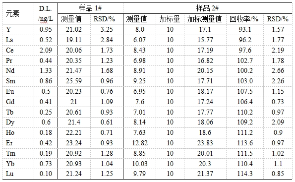 参考《GB/T 18115.1-2020 稀土金属及其氧化物中稀土杂质化学阐发体例 第1局部:镧中铈、镨、钕、钐、铕、钆、铽、镝、钬、饵、铥、镱、镥和钇量的测定》,将高纯氧化镧用稀硝酸消融,操纵内标法停止校订。考查加标收受接管率及精密度。体例加标收受接管率为98.9%~116.9%,精密度为0.28%~9.20%。
